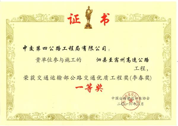 2016年交通运输部公路交通优质工程一等奖(李春奖)