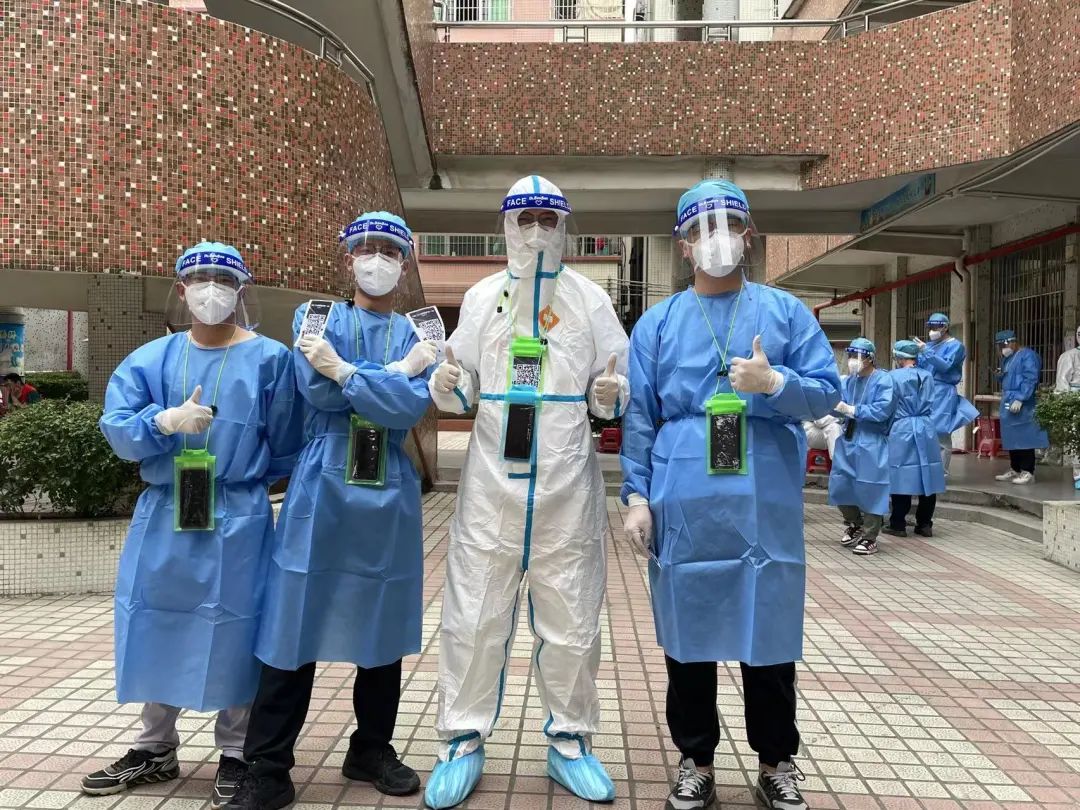 在海珠区江贝村,青年志愿者们穿上蓝绿色的防护服,犹如披上一件件“战袍”,为居民测体温、查验核酸码、维护现场秩序、喷洒消毒药水、负责运送防疫物资......