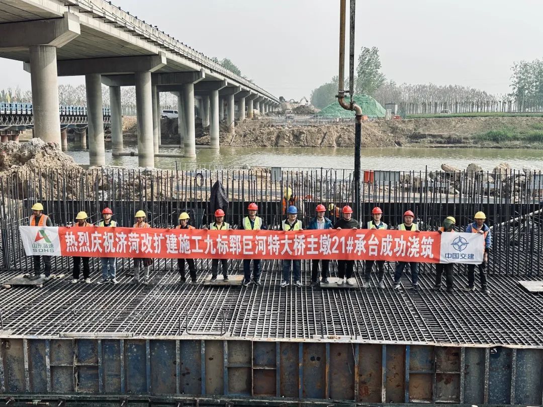 4月14日,济菏改扩建项目郓巨河特大桥左幅21#墩承台顺利完成浇筑任务,为整体施工目标的完成奠定了坚实的基础。
