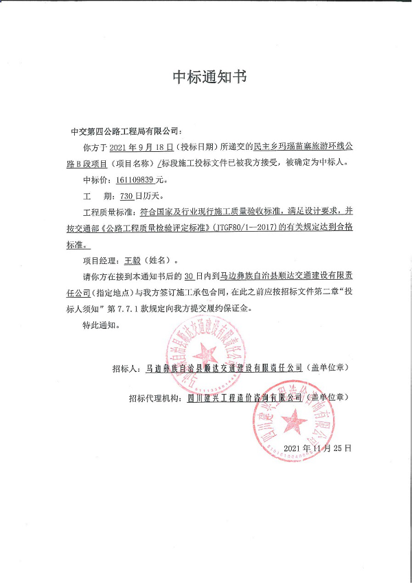 近日,七公司成功中标民主乡玛瑙苗寨旅游环线公路B段项目,项目建设工期730日历天,中标金额约1.61亿元。