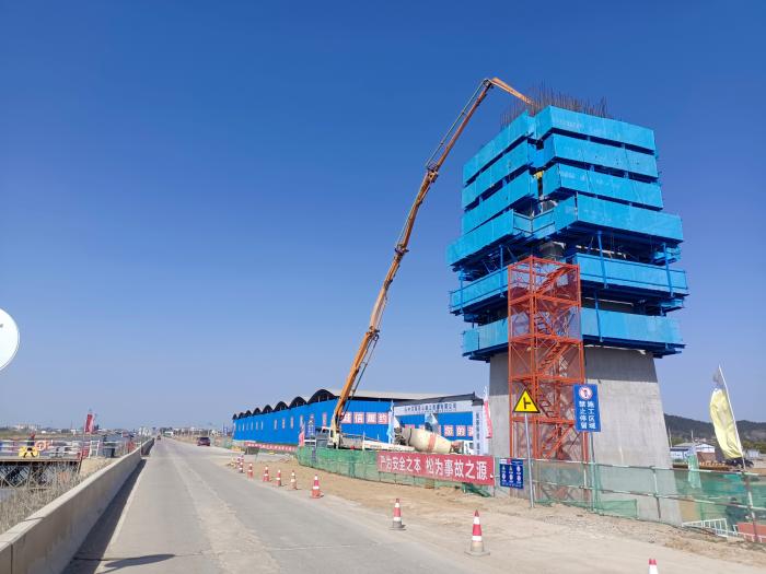 兆河特大桥桥梁全长 2187米,21×30+3×40+(150+80)+14×30米,共17联,主桥全宽27.5米,全长230米,位于桥梁第10联,为独塔单索面塔墩梁固结体系斜拉桥,高102.47米,采用矩形断面独柱式混凝土桥塔,下部采用承台及群桩基础。下塔柱采用C50混凝土,高24.97米,共六节,共浇筑方量为1110立方。由于主塔为大倾角、大摆角的空间“1字形”型结构,且面对配筋率高且钢筋构造复杂、隔板较多等施工难点,项目部通过多方比选设计了全新的爬模架体,克服了复杂的边界条件限制,在实际应用过程中,进行了模块化组装、灵活选装。在保证架体稳定可靠的前提下,缩短了安装时间。主塔是大桥施工的关键,其进度对主桥施工至关重要,为保证主塔施工各项工作万无一失,项目部多次组织召开专题工作会,研究、探讨、优化塔柱施工方案,从施工安全、质量、预埋件设置、浇筑层厚、布料等考虑,浇筑前召开了施工准备会,明确塔柱浇筑生产组织、物资供给、责任分工、技术保障等,制定科学施工方案并严格组织实施,对塔柱钢筋绑扎、混凝土工作性能、浇筑顺序、振捣作业及养护措施等方面进行了详细的技术交底,确保现场工料机配备到位,对起重吊装、模板支撑架搭设、模板拆卸施工等,均落实专人现场管理,真正将安全工作落实到实际操作中的每个环节,确保了施工安全。